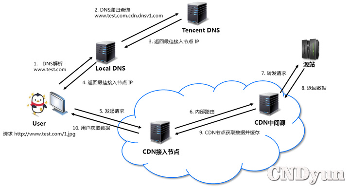 当 Local DNS 解析 www.test.com 时,会发现已经配置了 CNAME www.test.com.cdn.dnsv1.com,解析请求会发送至 Tencent DNS(GSLB),GSLB 为腾讯云自主研发的调度体系,会为请求分配最佳节点 IP。